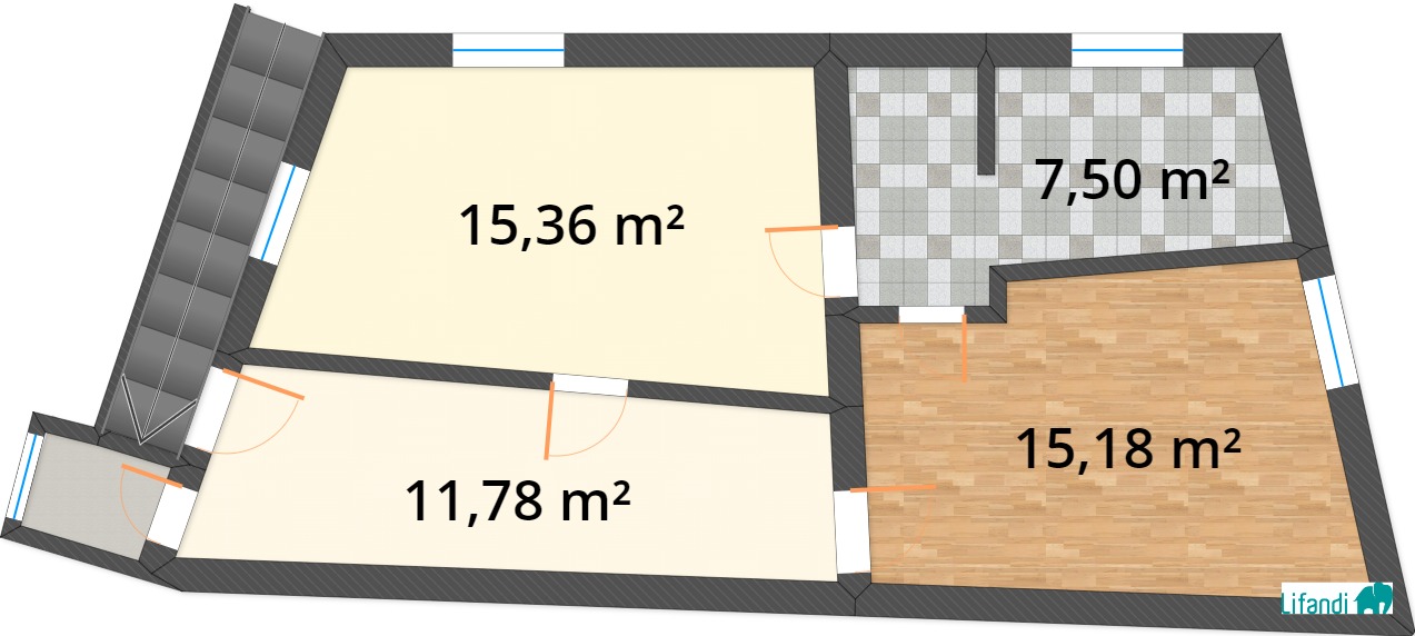 Der zweite Stock umfasst zwei Zimmer, ein großes Wohnzimmer und einen Balkon mit Außenblick.