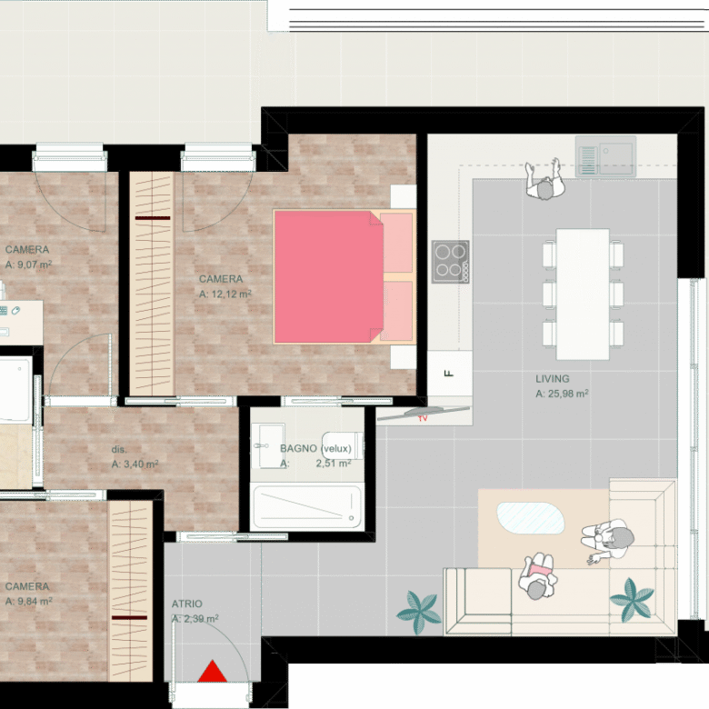 Das Wohnensemble umfasst eine ca. 237 m² große Wohnung, die sich durch einen großzügigen Eingangsbereich, ein lichtdurchflutetes Wohnzimmer mit offener Küche, zwei Doppelzimmer, zwei Einzelzimmer, zwei Badezimmer, einen Abstell/Waschraum, eine Dachterrasse, einen Wintergarten und einen Balkon auszeichnet.