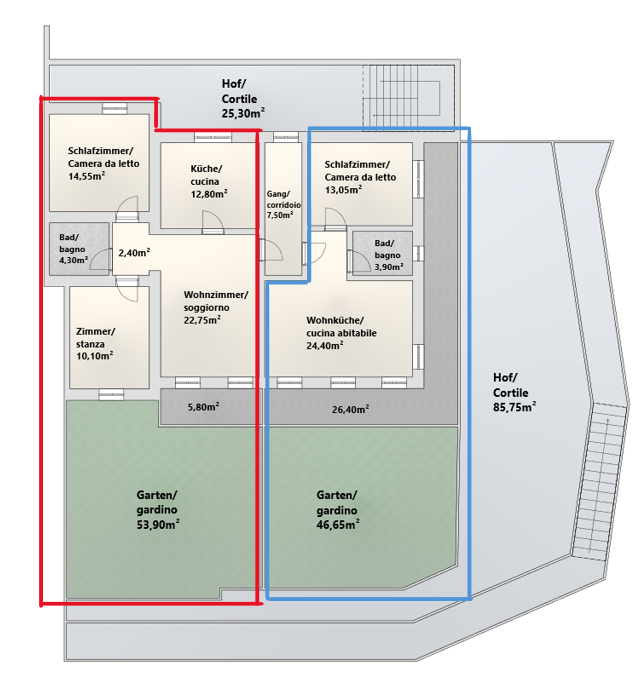 Ein besonderes Highlight ist der große Garten, der auf zwei Wohnungen aufgeteilt ist und viel Platz zum Entspannen, Spielen oder Gärtnern bietet.