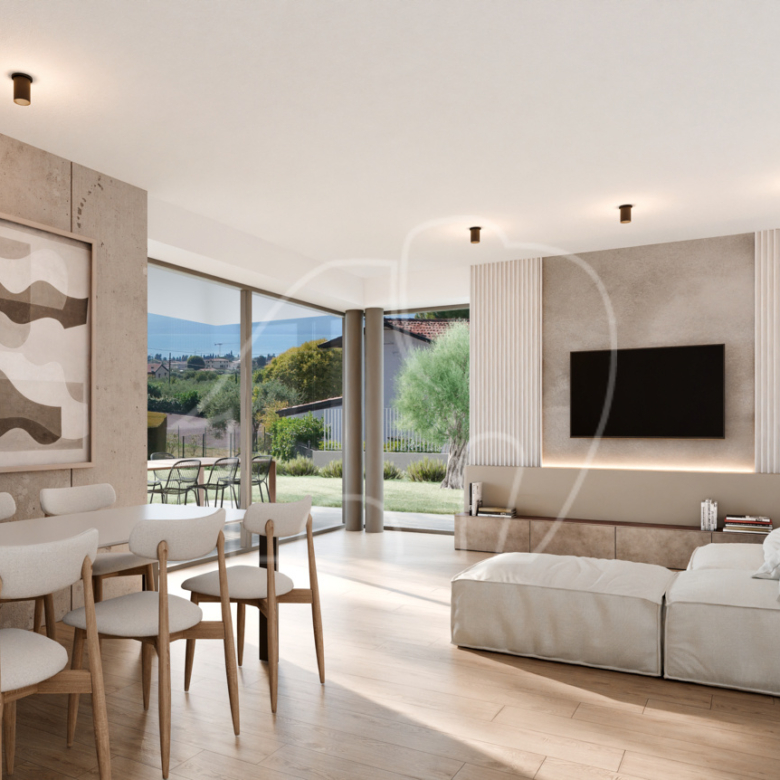 Der Eingang öffnet sich zu einem großzügigen Open-Space-Wohnbereich mit offener Küche, der durch große Fensterflächen erhellt wird und direkten Zugang zur Veranda bietet – ein idealer Raum, um jeden Moment des Tages zu genießen und gemeinsam zu verbringen.