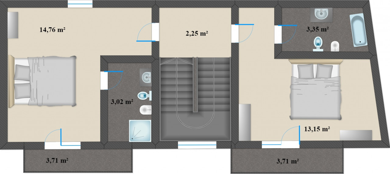 un’altra suite, oltre a un ripostiglio con bagno aggiuntivo. Il secondo piano ospita due suite, ciascuna con balcone e bagno privato. All’ultimo piano si trovano altre due camere da letto, anch’esse con bagno privato. Al piano terra è presente il locale caldaia.