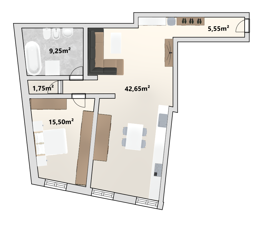 Grazie agli spazi generosi, l’intero appartamento appare aperto e luminoso – ideale per coppie, famiglie o come interessante opportunità di investimento.
