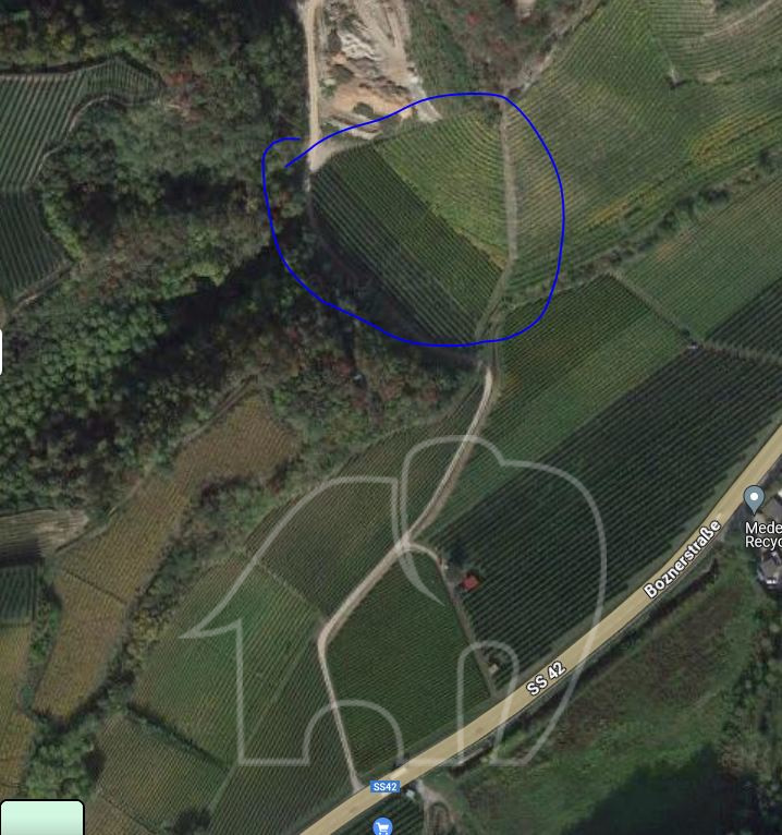 Ad Appiano sulla strada del Vino, direzione Pillhof, si vende un vigneto adibito Lagrein di 7983,50 m2 piantato nel 2020 + 3.557 m2 di bosco.