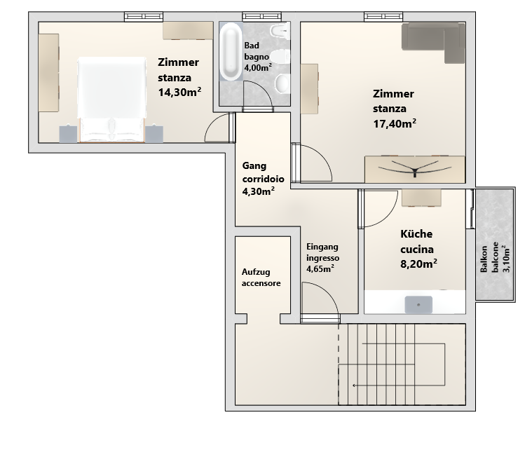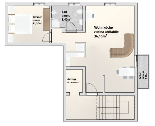 Il luminoso e spazioso bilocale si trova in Piazza Mazzini, nel ricercato quartiere di Gries, e gode di una posizione particolarmente tranquilla grazie alla sua esposizione.