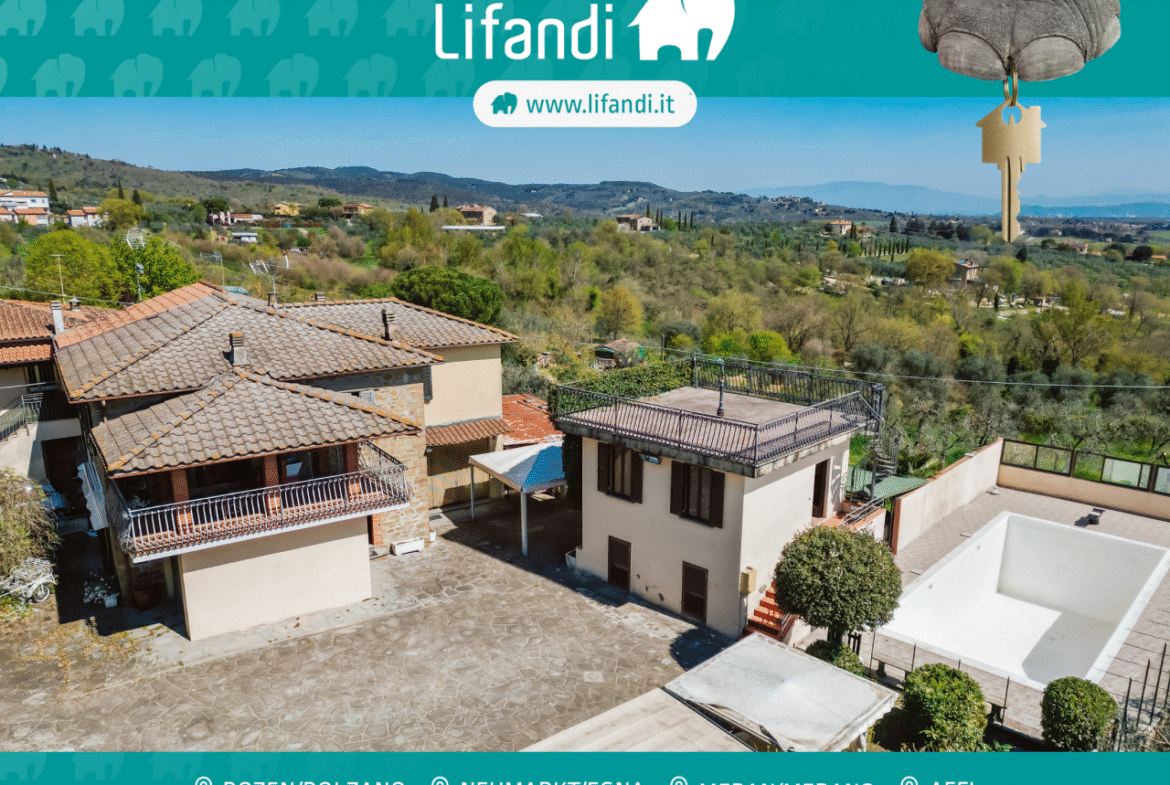 Autentica tenuta toscana con oliveto, vista panoramica e piscina – a Ciggiano, Val di Chiana . Immersa nelle dolci colline toscane, vicino ad Arezzo e al Lago Trasimeno, vi attende questa affascinante proprietà dal carattere rustico e dallo stile di vita mediterraneo. Un luogo che racconta una storia – e allo stesso tempo offre spazio per nuovi capitoli.La proprietà è composta da una villa indipendente (parzialmente annessa, ma indipendente) e da un ampio annesso, distribuiti su una superficie totale di circa 320 m². Le origini della casa principale risalgono al 1800, con una seconda ala aggiunta nel 1980. Il tutto è immerso in un terreno completamente recintato di circa 1.790 m² con circa 60 ulivi, un giardino ben curato e due vialetti separati.
