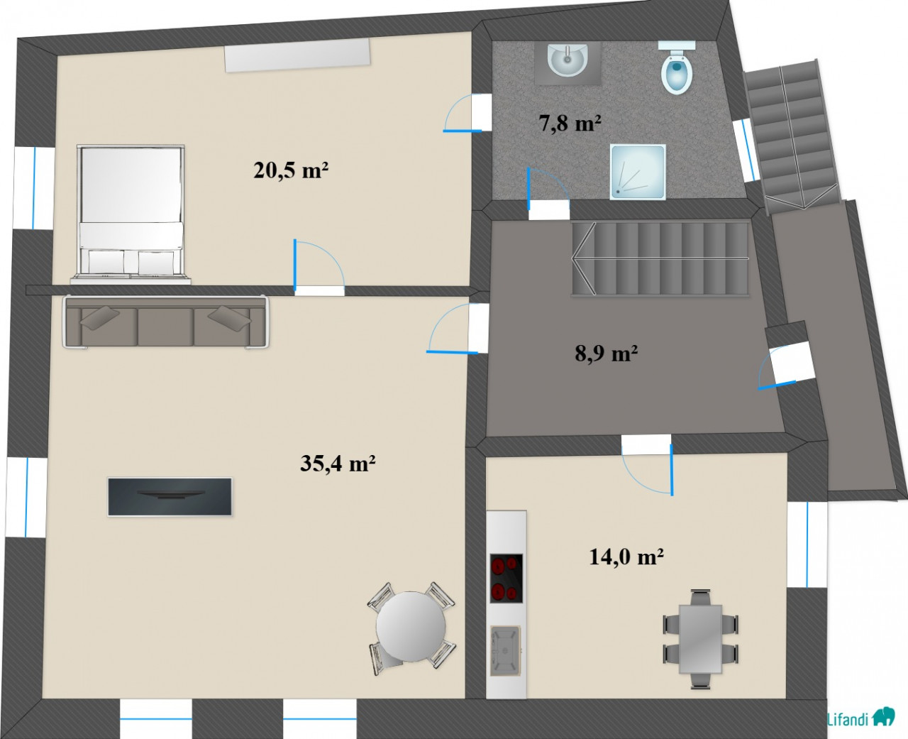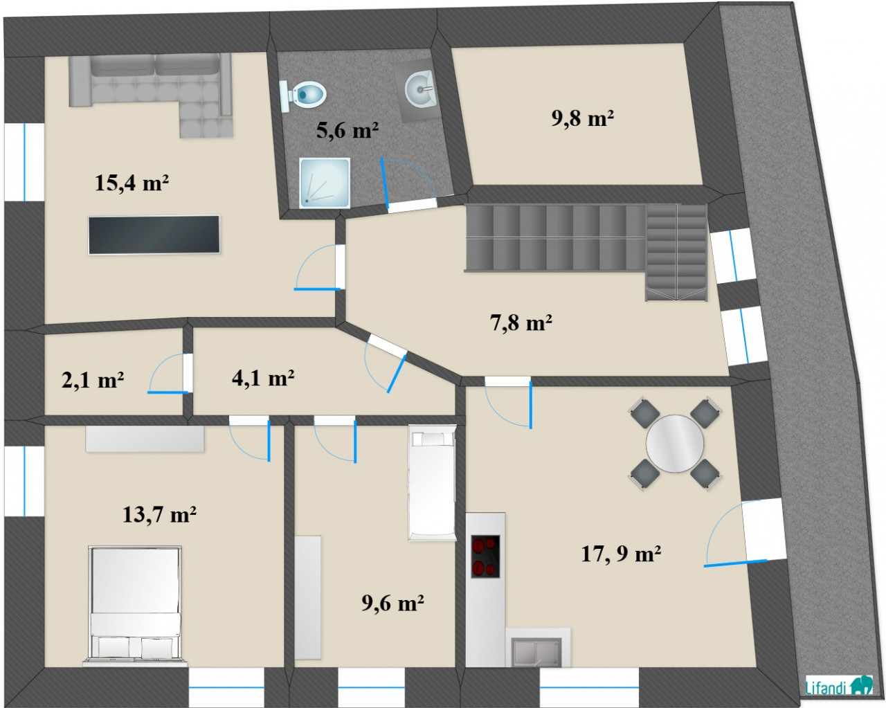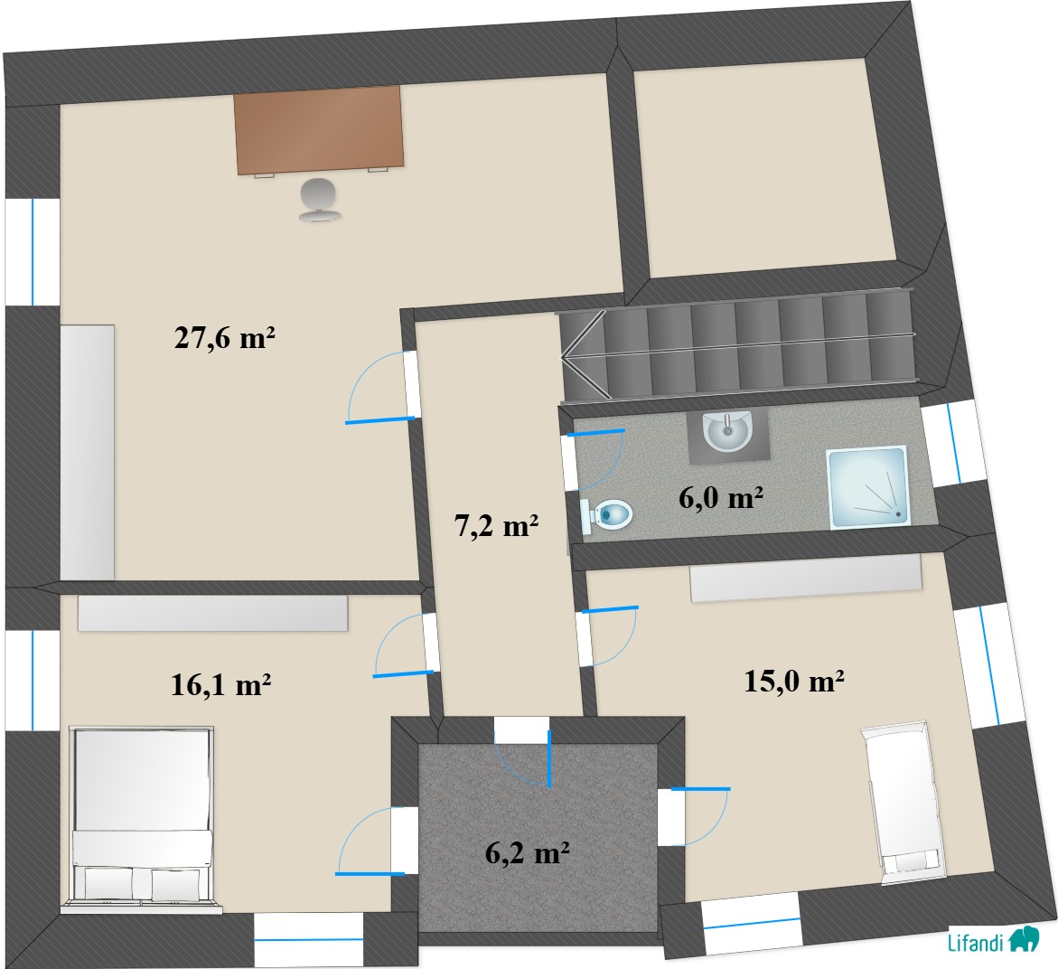 L’edificio è indipendente su tre lati (nord, ovest e sud), il che garantisce molta luce e un’atmosfera aperta. Si compone di un piano terra e di tre piani, sui quali si trovano tre appartamenti, ciascuno con una superficie netta di 90 m². Una caratteristica particolare di questo edificio residenziale è l’originale salotto a pannelli del XV secolo. Vi sono a disposizione anche un garage e diversi posti auto.