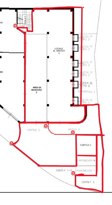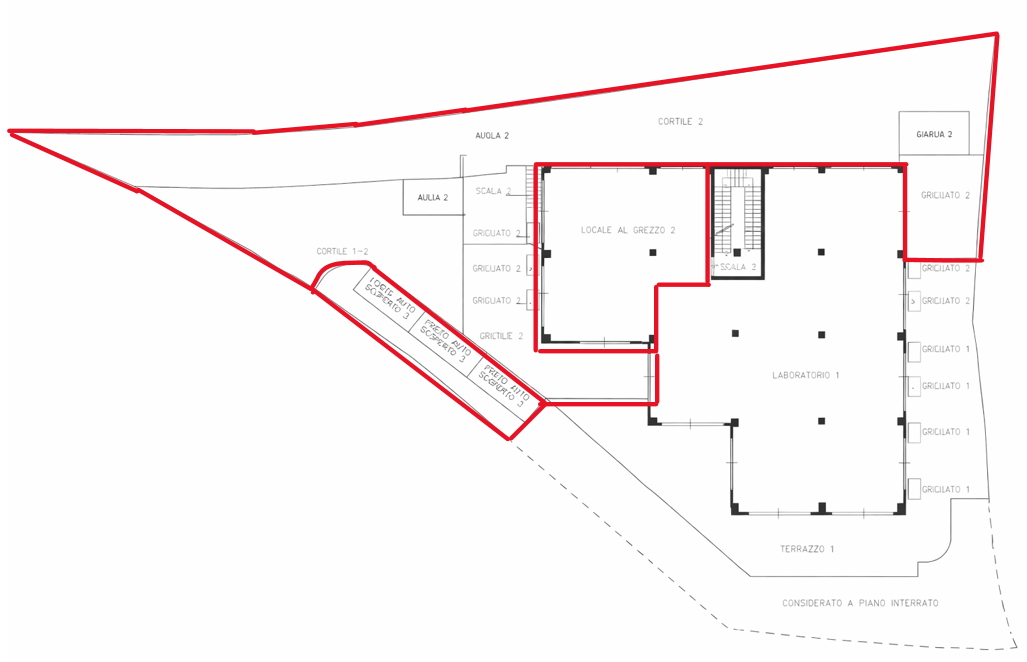 Il piano terra offre uno spazioso magazzino di 137 m², arricchito da un cortile e due aiuole.