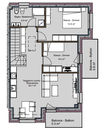 Due balconi invitano a godersi momenti di relax, un caffè al mattino o una serata all’aperto. Un posto auto esterno può essere acquistato separatamente, ideale per chi desidera mantenere la massima comodità.