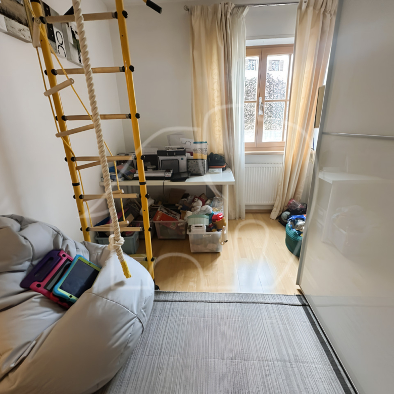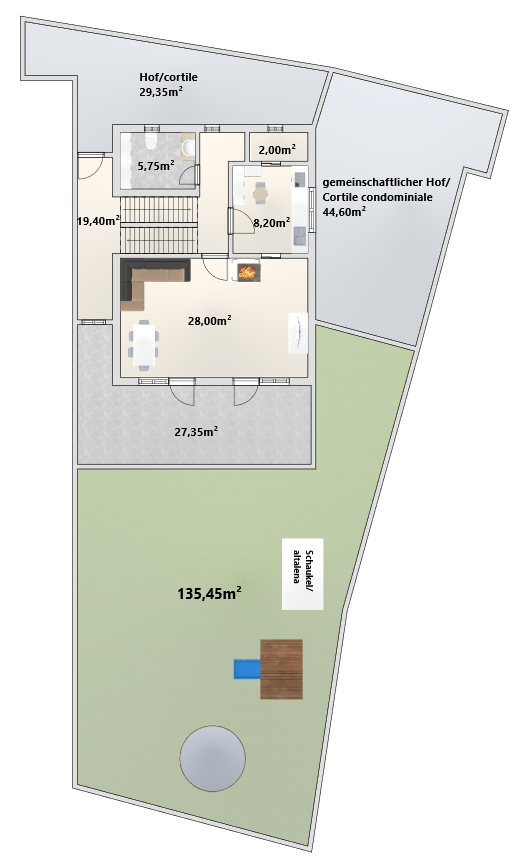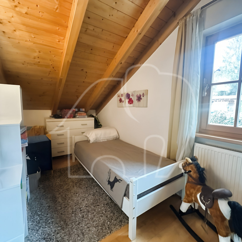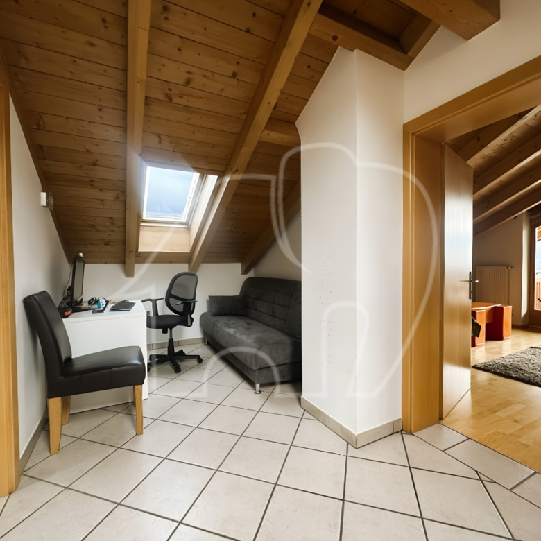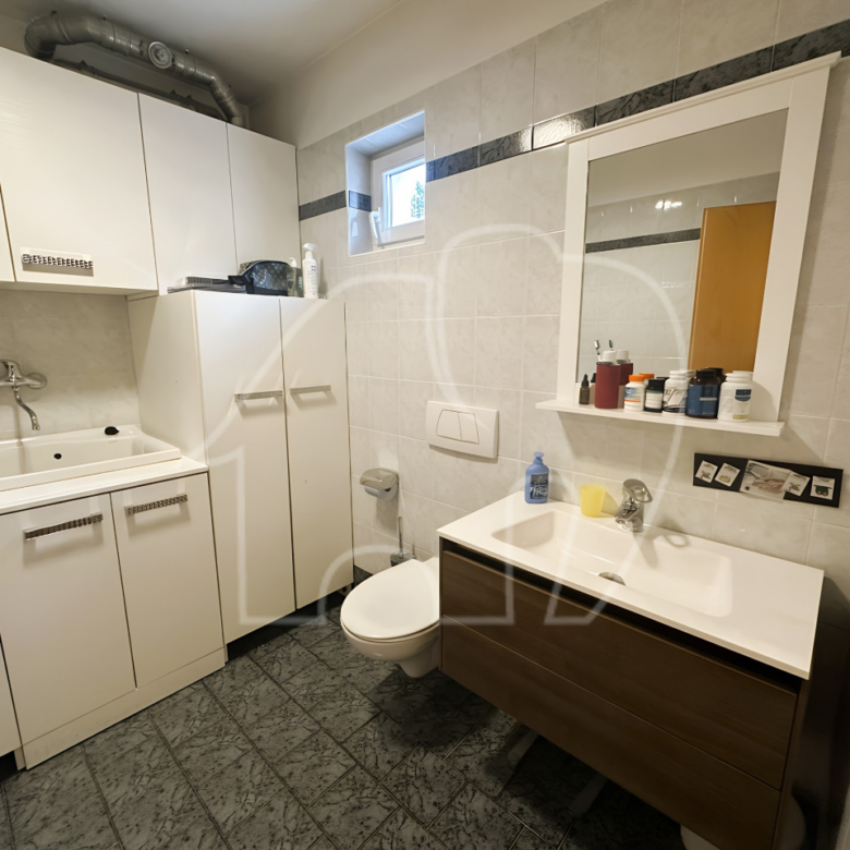 Il luminoso soggiorno con stufa crea un’atmosfera calda e accogliente e offre accesso diretto al giardino, perfetto per momenti di relax all’aperto. Completa il piano un bagno.