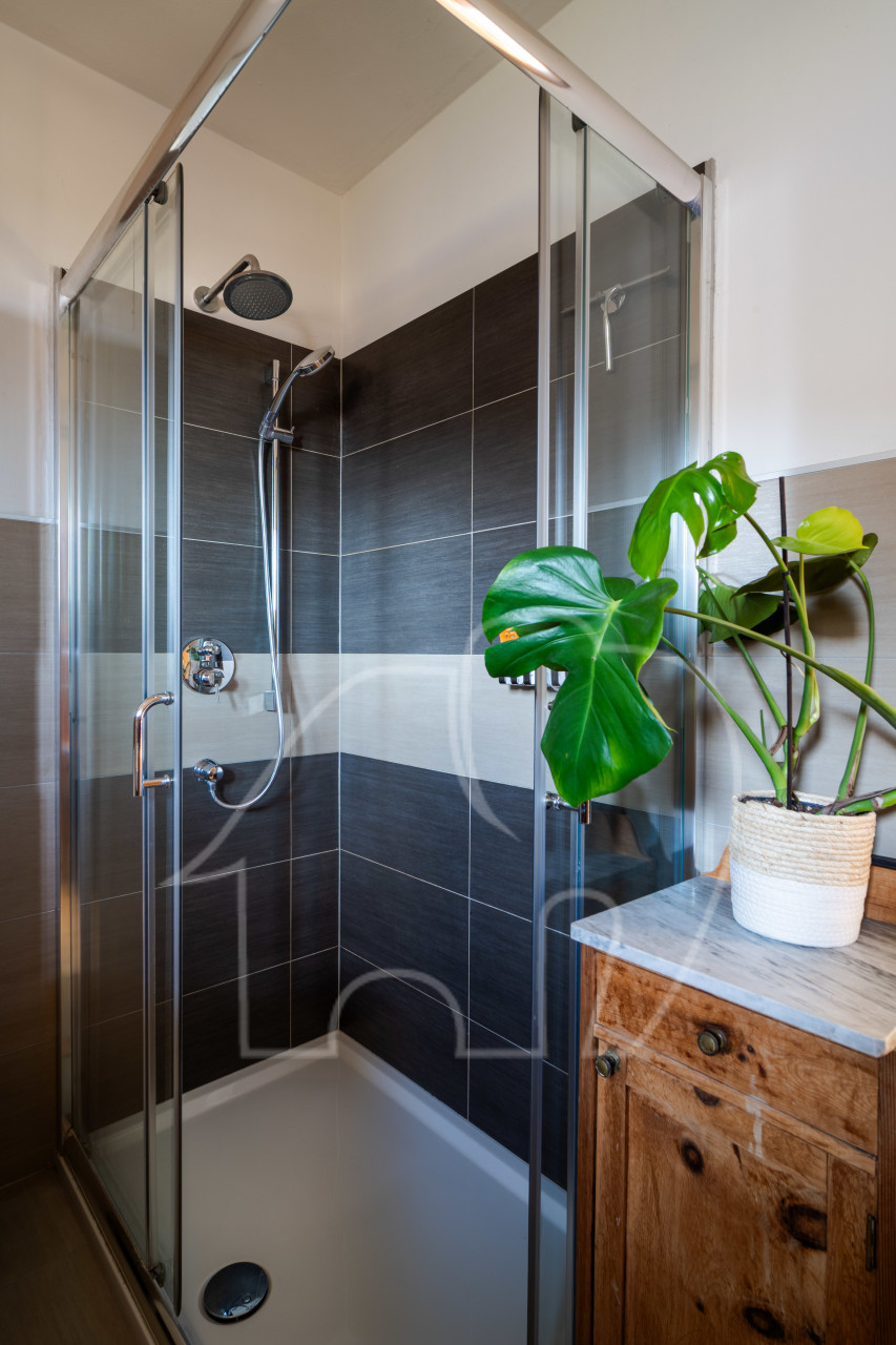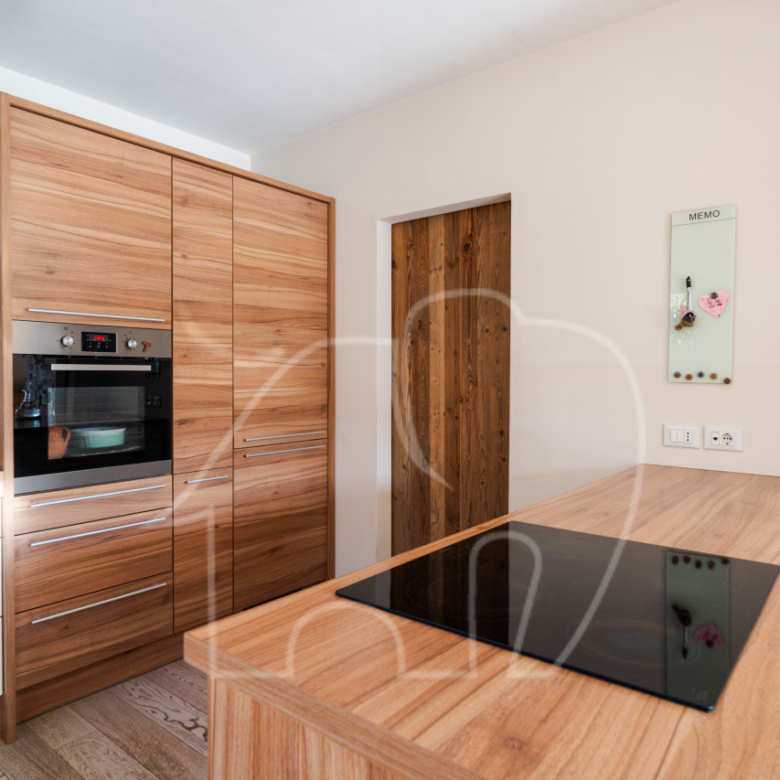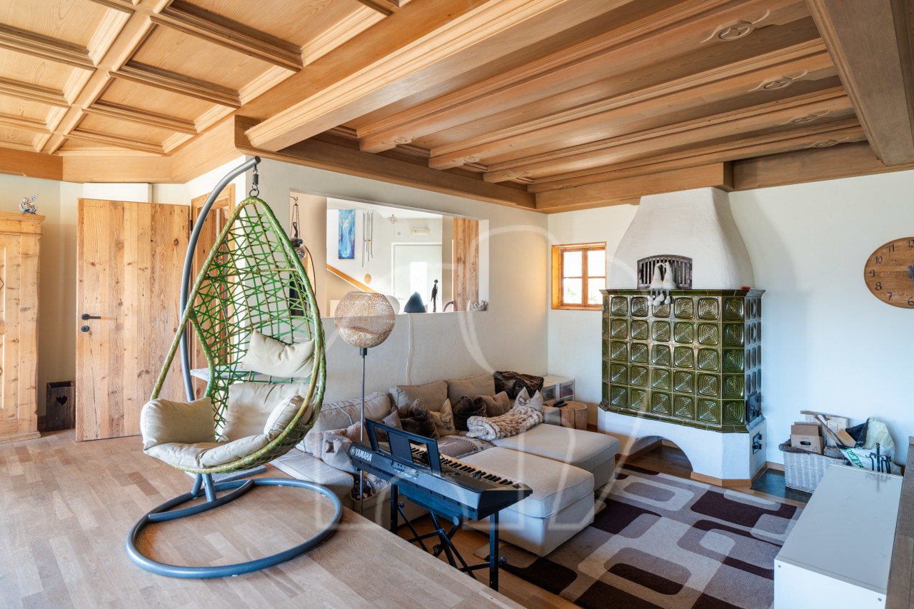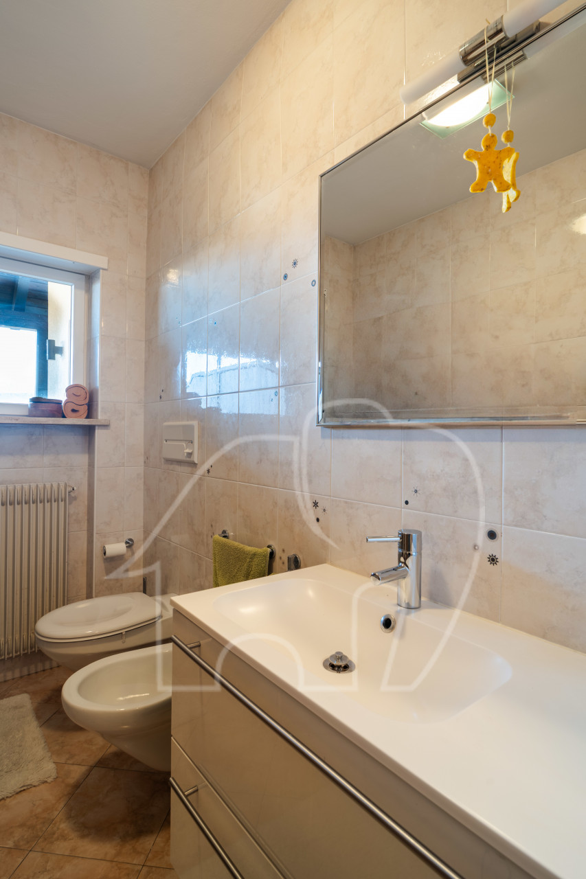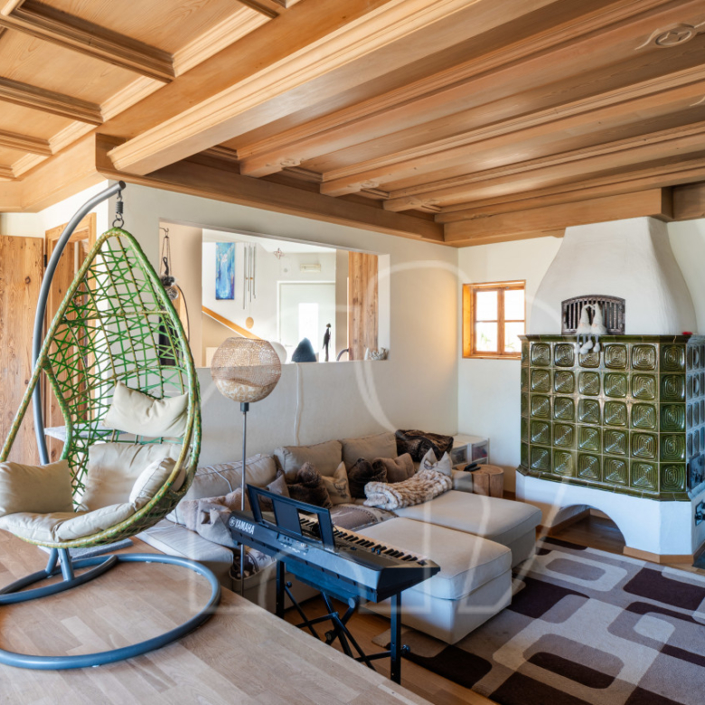 L’appartamento si sviluppa su due piani e accoglie con un ingresso ampio e luminoso. Al piano principale si trovano una cucina separata e spaziosa, un soggiorno luminoso con tradizionale stufa a maiolica e l’accesso diretto al giardino privato splendidamente curato – ideale per momenti di relax all’aperto. Completano questo piano un bagno di servizio.