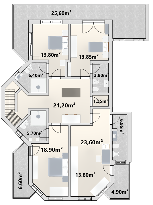 Al piano superiore sono presenti quattro camere da letto ampie, ciascuna con bagno privato, un disimpegno e tre balconi, che offrono ulteriori spazi e piacevoli zone di relax.