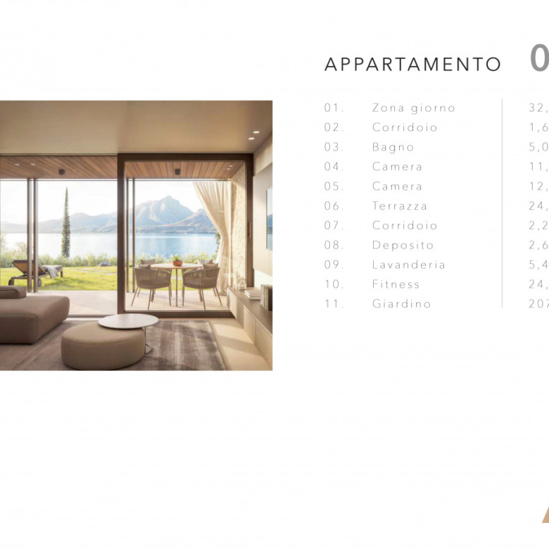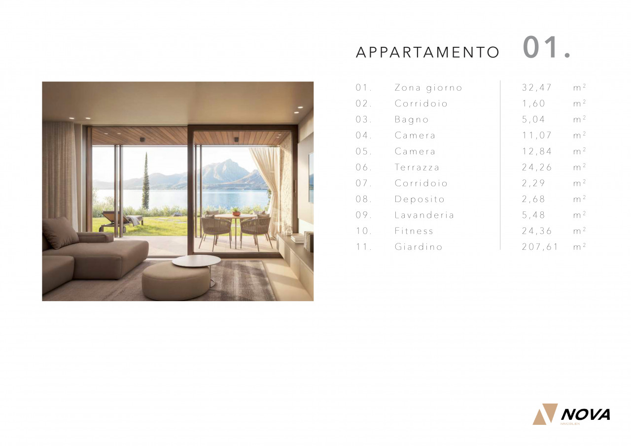 Ogni unità è valorizzata da un ampio giardino privato che si estende in direzione del lago, con terrazze caratterizzate da grandi vetrate che servono sia la zona living sia la camera principale. Gli interni si compongono di una luminosa area giorno, due camere da letto e un bagno.