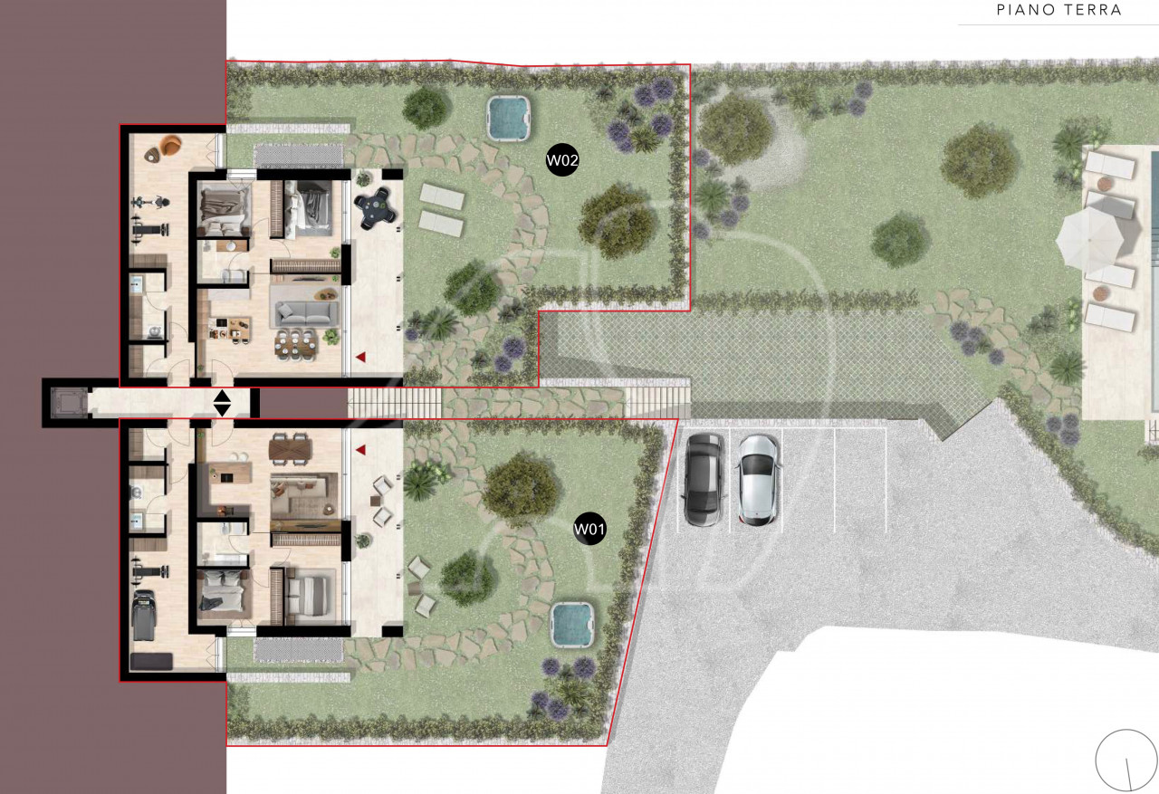 Sul lato ovest si apre l’area comune con piscina, solarium e ampio parco, inseriti in un contesto di quiete e benessere. Gli ambienti, progettati per garantire privacy e comfort, sono valorizzati da finiture di pregio e ampie vetrate che esaltano luce e panorama.