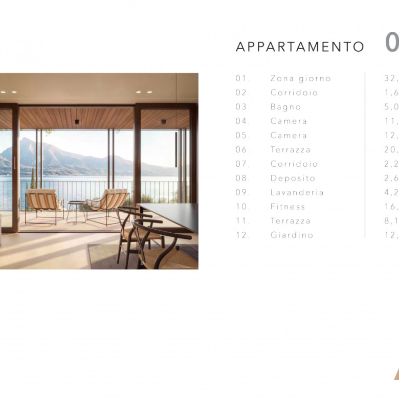 Ogni unità è arricchita da un giardino privato, posizionato a nord o a sud a seconda della sistemazione, e da una terrazza spaziosa con vista sul lago. Le ampie vetrate uniscono gli ambienti interni — soggiorno e camera da letto principale — agli spazi esterni, creando un’atmosfera luminosa e ariosa. Gli appartamenti comprendono una zona giorno ben illuminata, due camere da letto e un bagno.