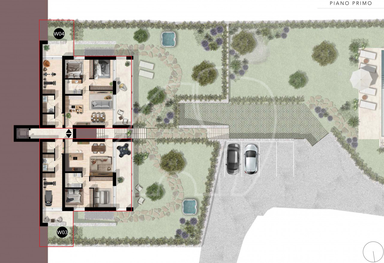 Sul lato ovest si apre l’area comune con piscina, solarium e ampio parco, inseriti in un contesto di quiete e benessere. Gli ambienti, progettati per garantire privacy e comfort, sono valorizzati da finiture di pregio e ampie vetrate che esaltano luce e panorama.