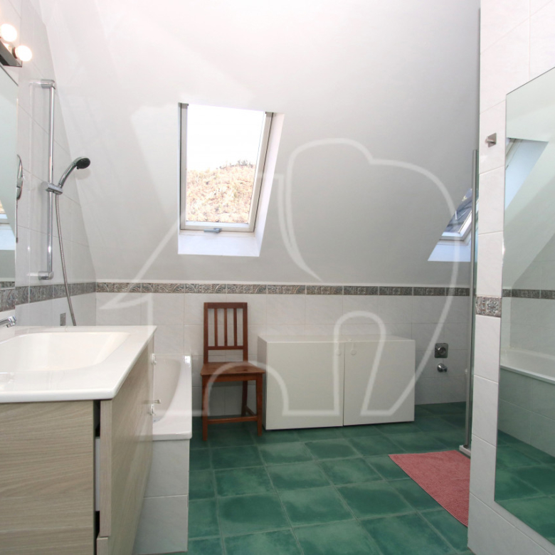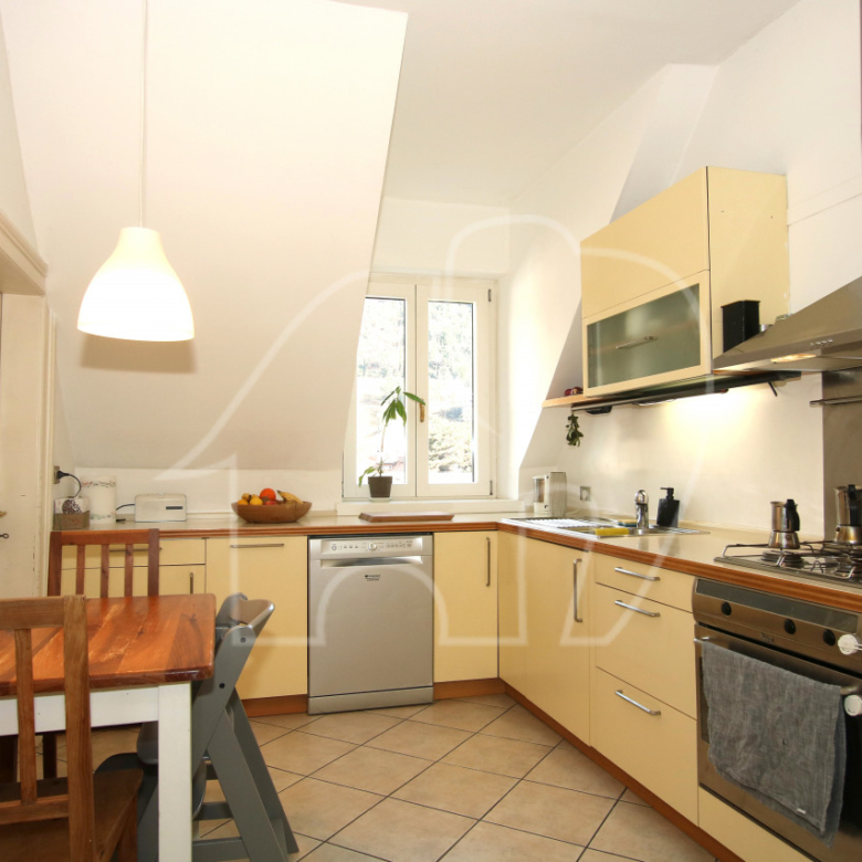 Gli alti soffitti e una stufa in maiolica raffinata conferiscono agli ambienti un’atmosfera accogliente e valorizzano il fascino di questa proprietà speciale.