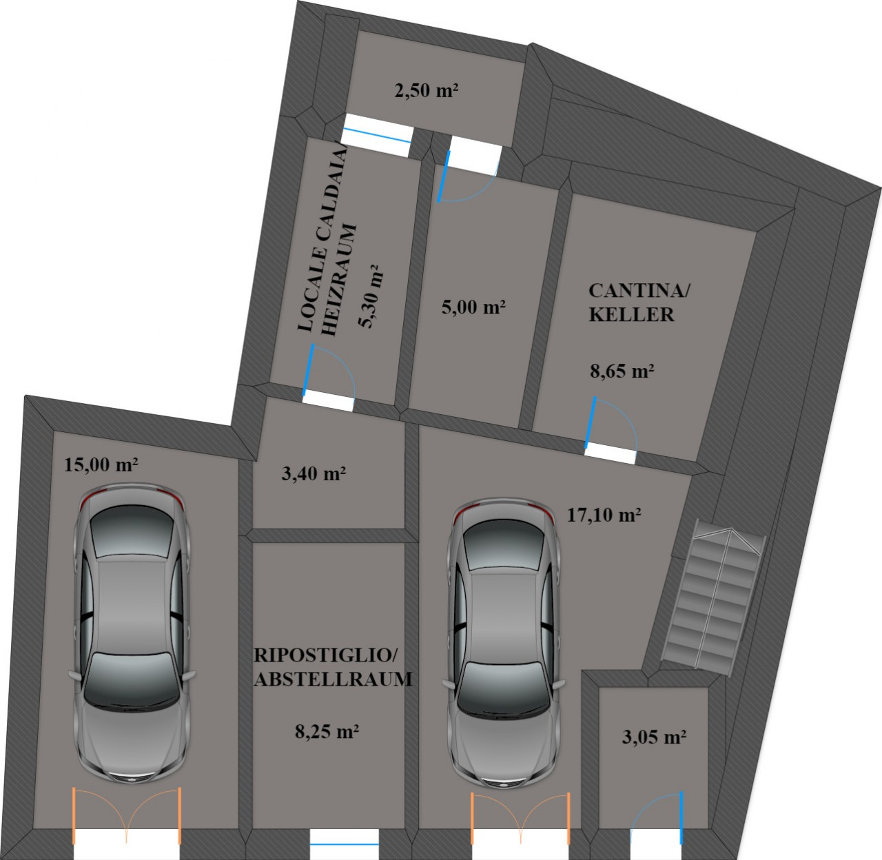 Al piano terra si trovano 2 Garage, 2 locali cantina e una centrale termica. Al primo piano invece l´immobile dispone di 1 cucina, 1 soggiorno, 2 stanze da letto, 1 bagno, 1 disbrigo e un balcone.