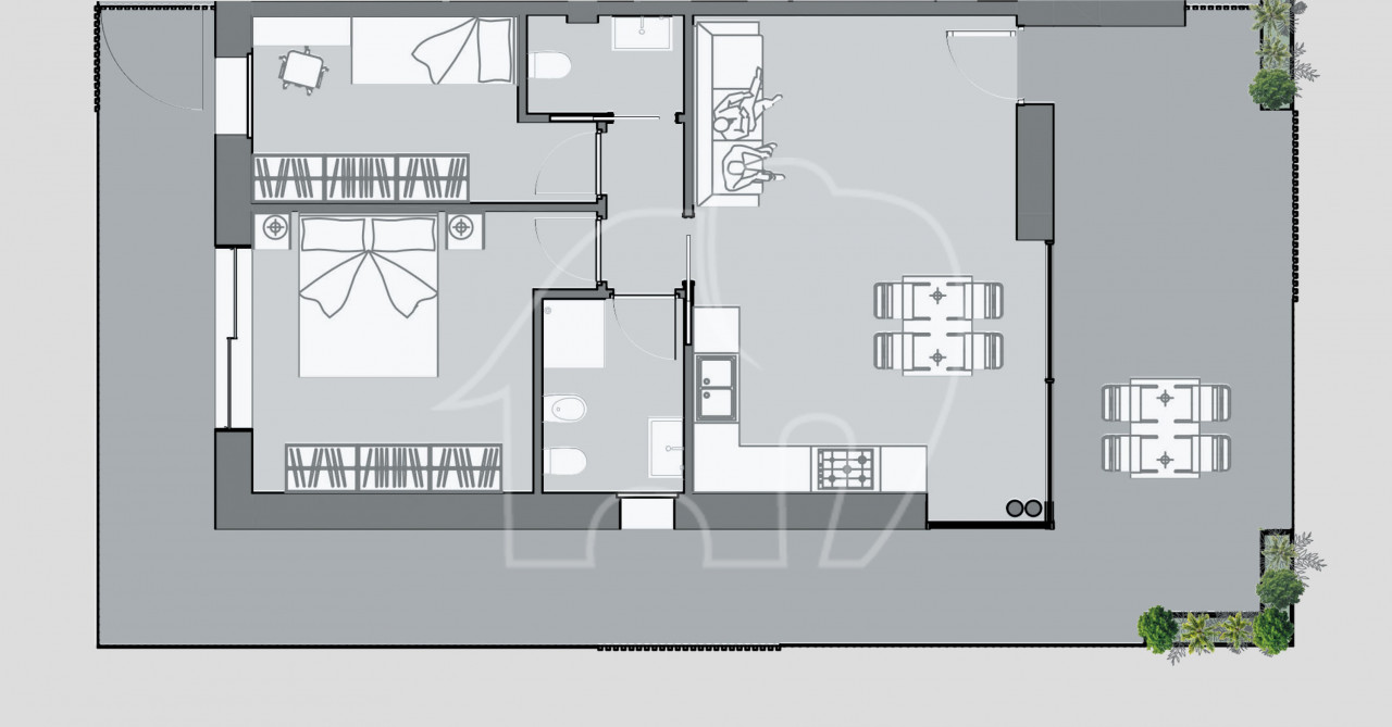La zona notte, separata con attenzione, ospita due camere da letto: la matrimoniale, ampia e dotata di bagno privato, e una seconda camera servita da un secondo bagno completo, entrambe realizzate con finiture di pregio e cura dei dettagli.