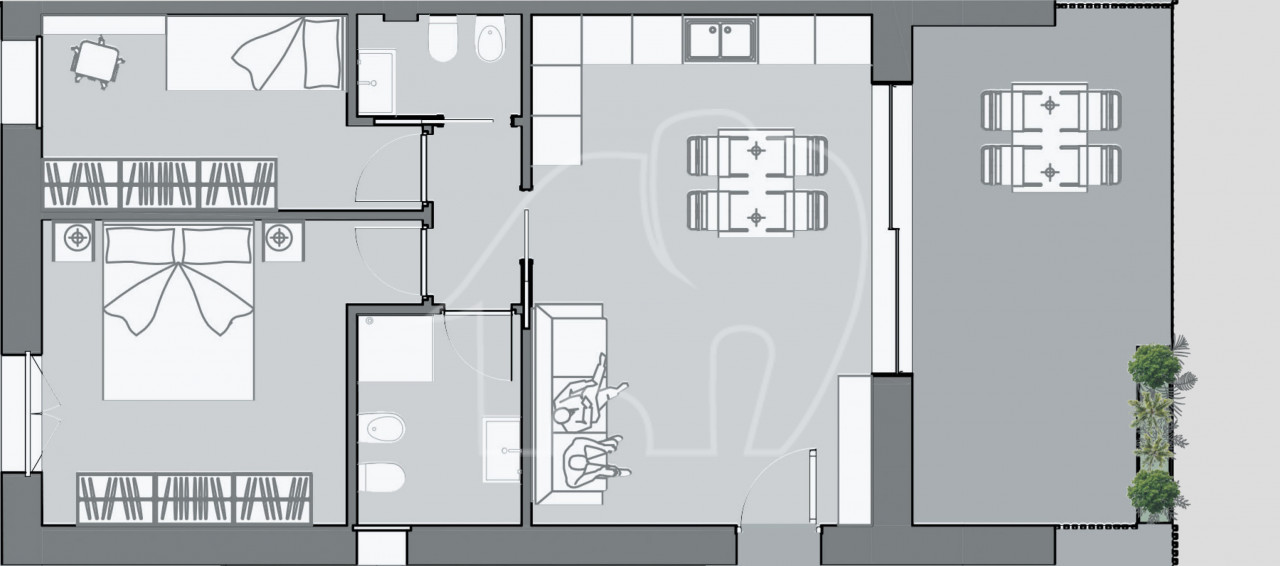La zona notte, sapientemente separata, comprende due camere da letto: la matrimoniale, spaziosa e dotata di bagno privato, e una seconda camera servita da un secondo bagno completo. Entrambe le stanze sono rifinite con materiali di pregio e attenzione ai dettagli.